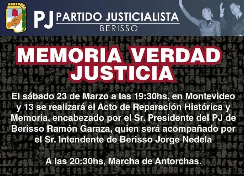Desde las primeras líneas del PJ local difundieron un flyer convocando al tradicional acto conmemorativo por la Memoria, la Verdad y la Justicia.