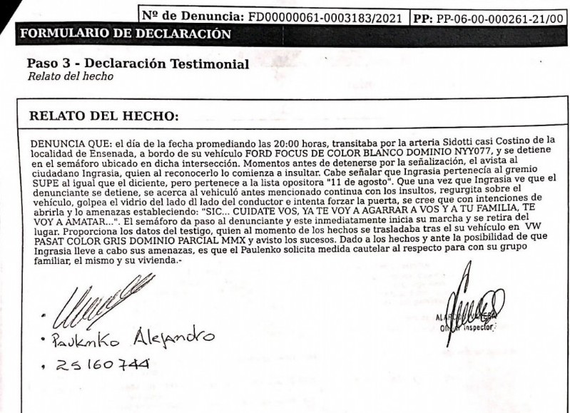El concejal del PJ- Frente de Todos de Berisso, a la vez secretario de Prensa del SUPeH, Alejandro Paulenko, fue blanco de amenazas de muerte en la ciudad de Ensenada por un empleado de una cervecería local, propiedad de integrantes de la agrupación opositora al gremio petrolero.