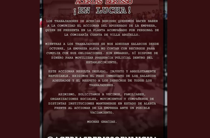 Además, remarcaron la contradicción entre la falta de pago a los empleados y la presencia de recursos para operativos dentro de la planta: “Mientras se nos adeudan salarios desde octubre, la empresa alega no contar con recursos, sin embargo sí dispone de dinero para movilizar presencia policial”, indicaron.