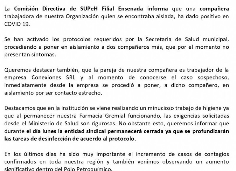 A través del escrito, desde el gremio comandado por Ramón Garaza informaron las medidas de higiene y prevención, llevando tranquilidad a la comunidad petrolera.