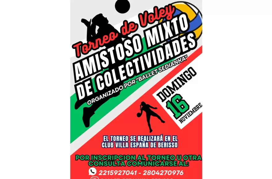 Por otra parte, el domingo 16 de noviembre tendrá lugar un torneo de voley amistoso mixto de colectividades, organizado por el Ballet Sedianka.