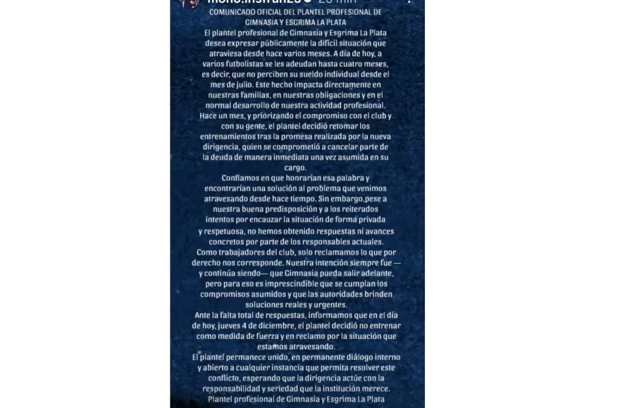 En la tarde de este jueves 4 de diciembre, el plantel profesional de Gimnasia y Esgrima La Plata difundió un comunicado oficial en el que expone la delicada situación económica que atraviesa el equipo desde hace varios meses y anuncia una medida de fuerza ante la falta de respuestas de la dirigencia.