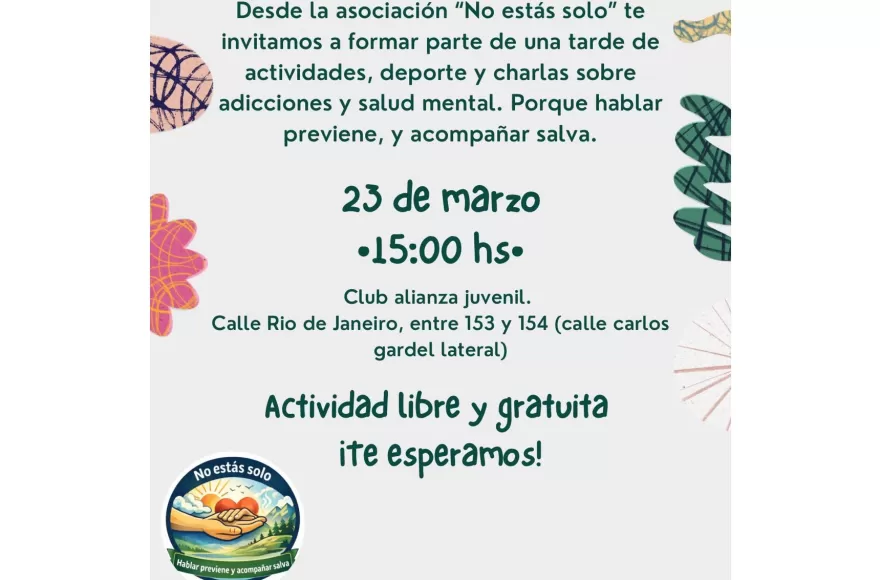 La asociación “No estás solo” impulsa una jornada abierta a la comunidad con el objetivo de generar un espacio de encuentro, escucha y concientización sobre el consumo problemático. La actividad se realizará el próximo 23 de marzo, desde las 15 horas, en el Club Alianza Juvenil, ubicado en calle Río de Janeiro entre 153 y 154, y contará con charlas, actividades deportivas y propuestas de prevención.