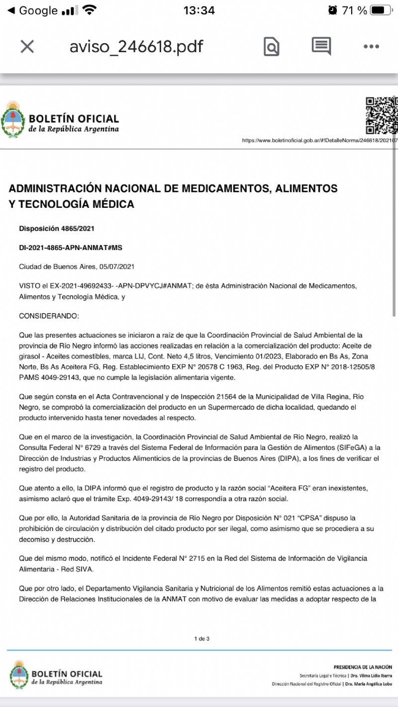 Se establece la prohibición de la elaboración, fraccionamiento y comercialización “en todo el territorio nacional y en las plataformas de venta digitales del producto rotulado: Aceite de girasol - Aceites comestibles, marca LIJ, elaborado en Bs As, Zona Norte, Bs As Aceitera FG, Reg. Establecimiento EXP N° 20578 C 1963, Reg. del Producto EXP N° 2018-12505/8 PAMS 4049-29143”.