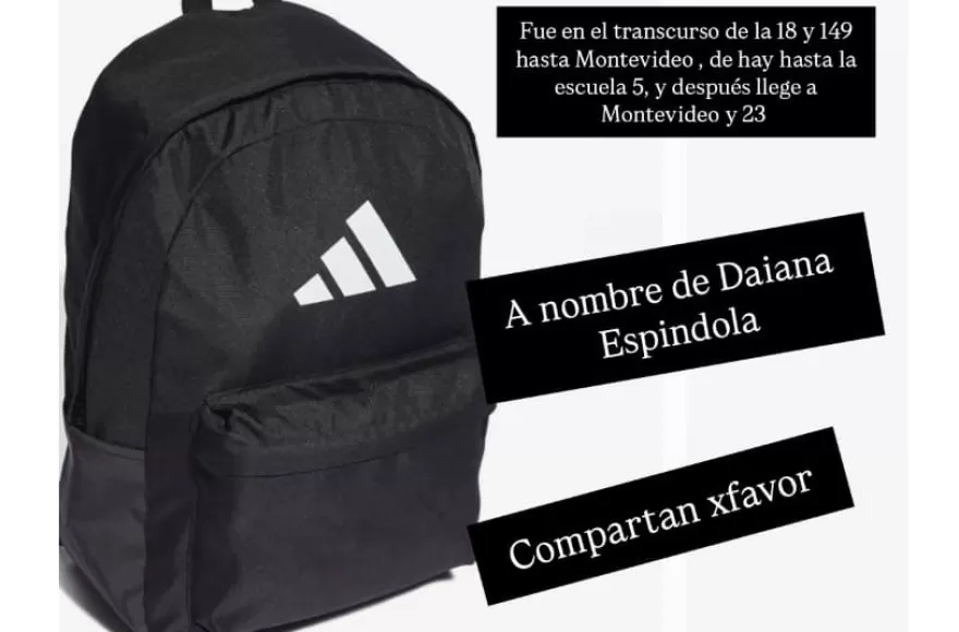 La vecina Daiana Espíndola pidió colaboración para dar con su mochila Adidas color negro, la cual extravió a primera hora de este martes en algún punto de 18 y 49 hasta Avenida Montevideo y desde allí a la Escuela 5.