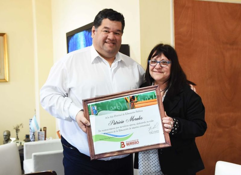 En la mañana de este miércoles, el intendente Jorge Nedela y el jefe de Gabinete Alberto Amiel, recibieron y distinguieron en el despacho municipal a Patricia Morales, quien cumplió funciones como jefa distrital de Educación Pública hasta cumplir su edad jubilatoria.