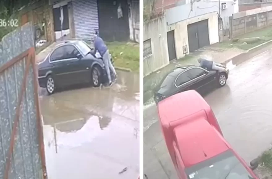 Un caso insólito ocurrió pasadas las 12.30 horas de este sábado en calle 152 entre 13 y 14, en medio de los trastornos del temporal, cuando un vecino terminó en el capot de un auto.
